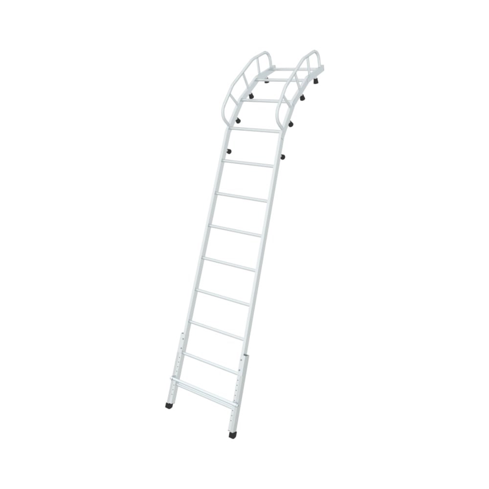 Лестница для цистерн MEGAL ЛАЦ - 5-3.2 4687201846420 применяется при проведении работ на цистернах диаметром 3.2 м. Ступени выполнены из рифленого профиля, максимально смещены к краю лестницы для удобства подъема. На всех опорных элементах установлены противоскользящие башмаки, что обеспечивает надежную установку. Опорные концы модели оборудованы регулируемой по высоте опорой (ход - 500 мм, шаг - 50 мм), сверху – пластиковыми заглушками. Обратите внимание! Количество ступеней не соответствует представленному на фото.