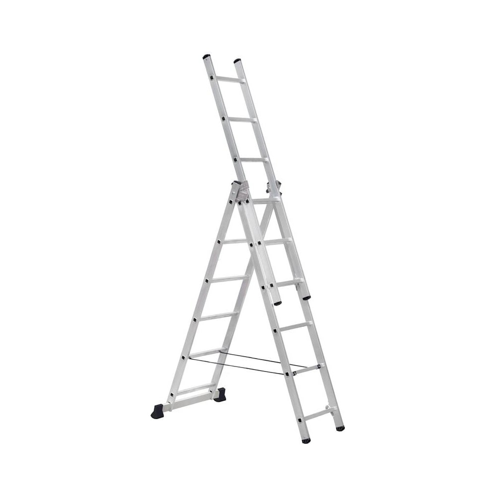 Универсальность данной лестницы заключается в том, что она может использоваться как раздвижная приставная лестница из трех частей и как свободностоящая стремянка (перевернутая русская буква 'У'). Более того третья секция является съемной, и ею можно пользоваться отдельно как приставной лестницей, а оставшаяся часть при этом представляет двухсекционную универсальную лестницу. Необходимый для прочности перехлест второй и третьей секции обеспечивается боковым упором. Вставить третью секцию сверху через верхний соединительный узел и обойти этот упор невозможно. Устойчивость. Лестница оснащена поперечной траверсой и специальными опорные заглушками с протектором, исключающими скольжение. Прочность. Качественный профиль позволяет ей выдерживать нагрузку до 150 кг.
