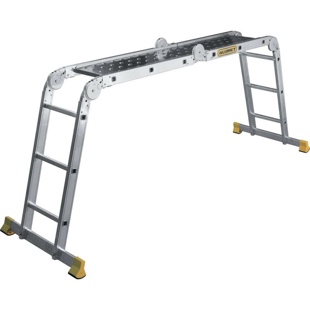 Лестница шарнирная алюминиевая четырехсекционная профессиональная с платформой– представляет собой лестницу-трансформер, состоящую из четырех секций, последовательно соединенных между собой стальными шарнирами. Шарнины имеют три угла фиксации, которые обеспечивают лестнице положения: -приставная, -стремянка, -приставная под крышу, -помост (только с настилом. Входит в комплект).Тетивы, ступени и стабилизатор лестницы изготовлены из высокопрочного алюминиевого сплава (ГОСТ 22233-2018), обеспечивающего изделию прочность и легкость, что важно для транспортировки и установки. Ступени выполнены с рифлением,что способствует безопасному подъёму и спуску.Идеальный помощник на производстве, в офисе, в быту, на даче или гараже.Лестницу можно использовать вне помещения. Конструкция стойкая к воздействию неблагоприятных погодных условий благодаря коррозионностойким свойствам алюминия. Этот фактор является одним из главных преимуществ модели.Особенности лестницы: широкий профиль, усиленные шарниры, два стабилизатора.Данная линейка лестниц подходит для строительства и ремонта на профессиональном уровне.!Доукомплектовать лестницу можно: шарнирами HВВ10-16, стабилизатором STB, комплектом заглушек для стабилизатора ZGS!Завод – изготовитель оставляет за собой право в одностороннем порядке вносить изменения в конструкцию, в целях улучшения технических характеристик.на линейные размеры отклонение может составлять +-5 мм, на вес изделия +-5%