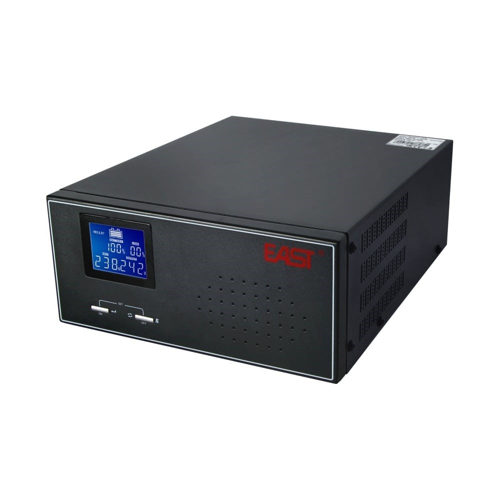 Линейно-интерактивный ИБП East без АКБ 300ВА Home 300 с чистой синусоидой, обеспечивает длительное время автономной работы. Внутренних аккумуляторов не имеет, поэтому к нему подключается один внешний, отдельно приобретаемый аккумулятор большой емкости. В зависимости от емкости внешнего аккумулятора необходимо установить соответствующий ток заряда.
