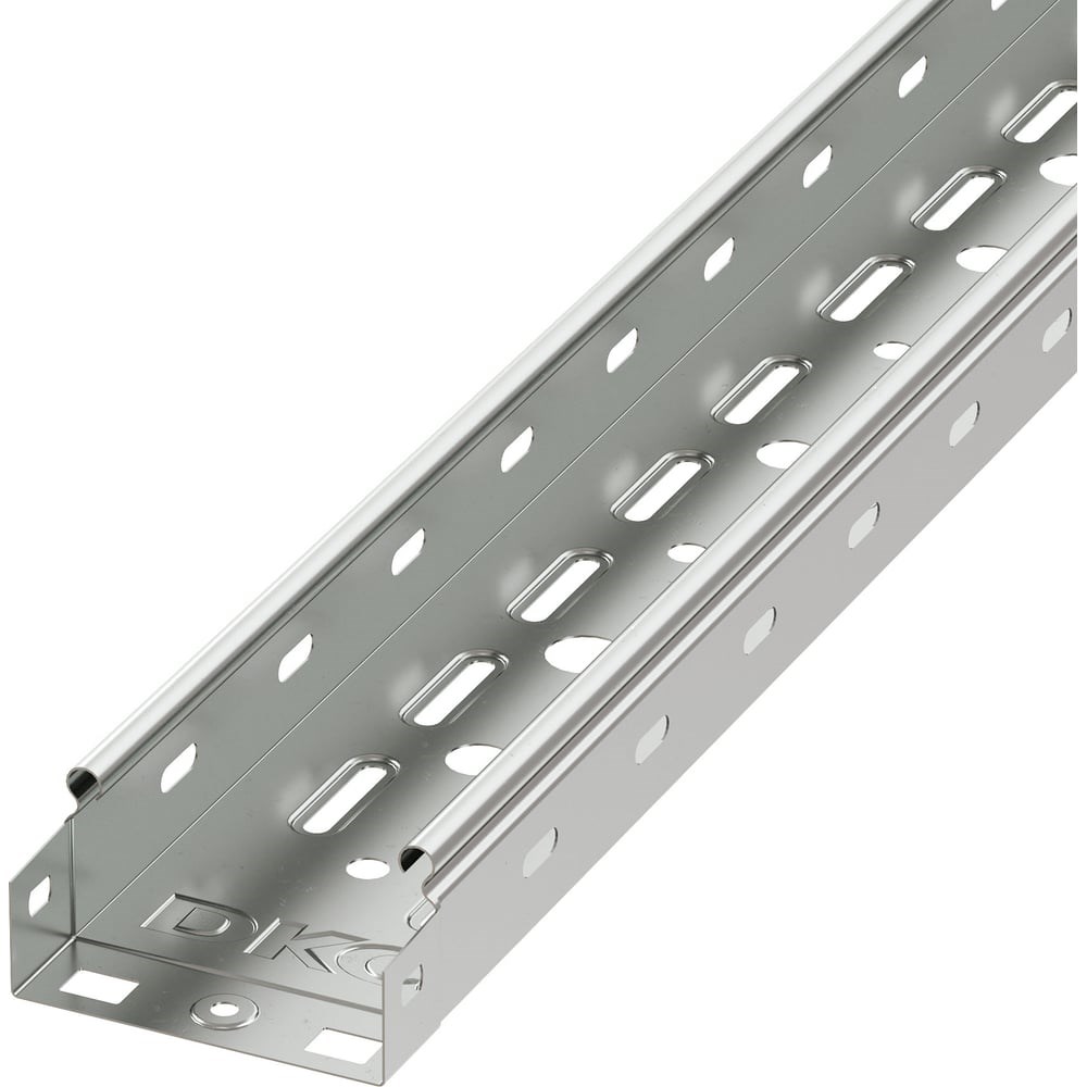 Перфорированные листовые лотки ДКС применяются для прокладки кабеля как в помещении, так и на открытом воздухе. Лотки отличаются высокой несущей способностью – подформовка, производимая при производстве этой продукции, создает дополнительное ребро жесткости, что увеличивает несущую способность системы до 54%. Перфорация сокращает вес конструкции. В лотках имеются отверстия для отвода кабеля. Степень пыле- и влагозащиты перфорированных лотков – IP 10 при использовании крышек, входящих в состав системы. Метод соединения "мама-папа" применяемый для системы, существенно сокращает время монтажа и создает непрерывный контур. Конструктив листовых лотков ДКС предупреждает повреждение кабеля при прокладке. Высота лотка – 50 мм, ширина – 100 мм, длина – 3000 мм, толщина - 0,7 мм. Лотки в специальном исполнении "Горячий цинк" отличаются повышенной стойкостью к коррозии и воздействию агрессивных сред.