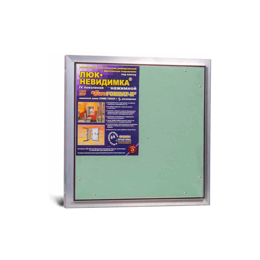 Люк-невидимка Практика Евроформат ЕТР 50-50 - это люк под плитку, предназначенный для обеспечения легкого доступа к водосчетчикам, шаровым кранам подачи воды и сливному сифону под ванной. Имеет расширенную систему регулировки дверцы (по вертикали, горизонтали, углу наклона) и встроенный силиконовый уплотнитель. Изготовлен полностью из алюминия, при этом грузоподъемность петлевого механизма не уступает стальным аналогам. Люк Евроформат ЕТР оснащен мощным магнитно-нажимным замком CombiTOUCH, который разработан конструкторами "ППК "Практика" для использования в люках под плитку и конструктивно исключает любую возможность заклинивания. Важно учитывать: - Толщина материала для облицовки люка должна быть не более 15 мм. - Допустимый выступ плитки на дверце со стороны петли – до 50 мм, с остальных сторон – не более 1/3 от ширины, высоты материала. Заранее планировать сторону открывания – влево или вправо, не нужно. Просто переверните люк на 180°, если это потребуется. Люк-невидимка Практика Евроформат ЕТР 50-50 имеет размеры рамы 50х50 см и дверцы 44х44 см, толщина люка - 5,5см.