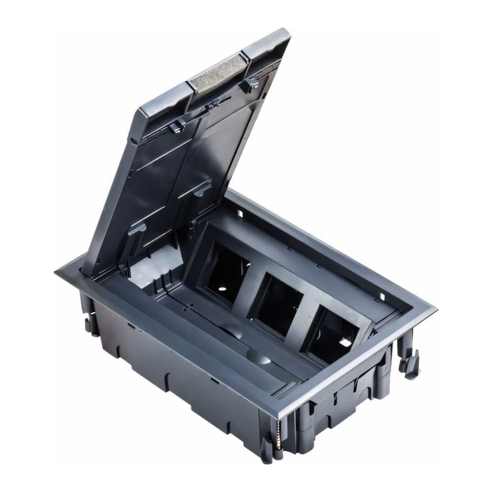 Люк в пол на 6 постов. Возможна установка напольного покрытия в крышку, углубление 7мм . Монтаж: В фальшьпол с толщиной плит до 40мм (коробка для фальшпола идет в комплекте). В стяжку монолитного пола (рекомендуется использовать металлическую коробку арт. 70161, поставляется отдельно). Монтаж ЭУИ: модульные механизмы поставляются отдельно - серия LK45 (арт. 851104-1, 851107-1, 851204, 87002, 87013-1, 87001-1, 856100-1 ). *1 модуль= 45*22,5мм. *2 модуля = 45*45 мм (1 пост).