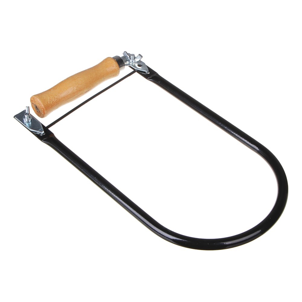 Ручной лобзик по дереву от бренда Рокот - это U-образная металлическая рамка, между концами которой натянуто пилящее лезвие. Лезвие крепится к зажимам. Зажимы можно вращать и создавать разные плоскости для пиления. С одной стороны рамки деревянная рукоятка. Лобзик используют, чтобы выпиливать из фанеры сложные контуры, в том числе криволинейные. Длина лезвия 130 мм.