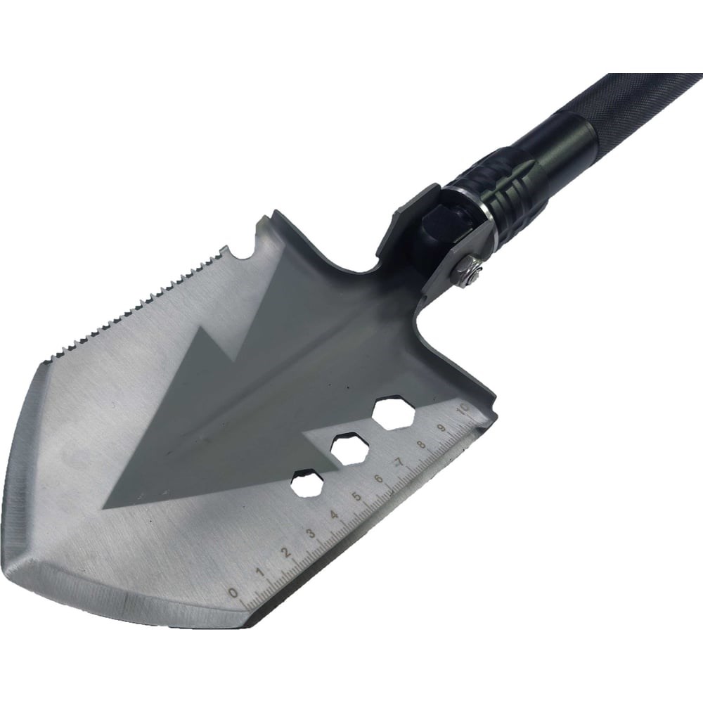 Шикарная, многофункциональная походная и одновременно туристическая складная лопата. Собирается из трех секций. В среднюю секцию вкручивается нож с открывалкой. Крестообразная и плоская отвертка. Магниевое огниво и свисток, зафиксированное во внутренней части хвостовика. Особенностью самой лопаты является наличие заточенной пилы с грамотной разводкой, которая реально можно быстро перепилить небольшие деревья, сучья и так далее. Другое ребро лопаты представляет собой топор, можно с размаха перерубить шнур, кабель, небольшие сучья.