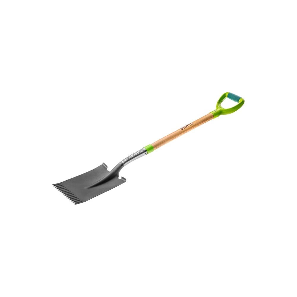 Лопата (прямой штык, деревянный черенок) VERTO 15G002 оснащается двухкомпонентной рукояткой, которая не скользит в руке. Специальная зубчатая кромка легко входит в грунт, прорезает корневую систему и разделяет комья глины. Место соединения черенка со штыком дополнительно усилено.