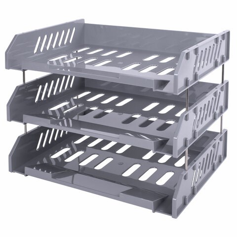 Изготовлены из прочного полистирола. Размер лотков в собранном виде - 335х232х246 мм. Комплект из 3 лотков обладает устойчивой конструкцией, благодаря которой удобен для хранения объемных документов и папок. Выполнены в сером цвете.
