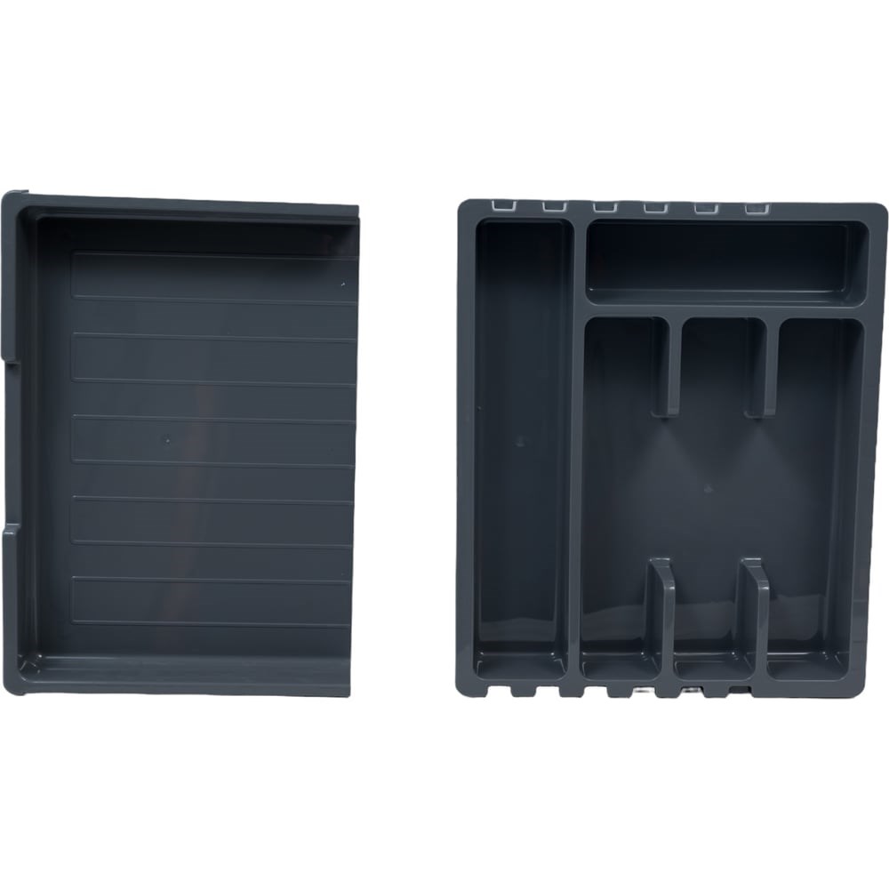 Универсальный раздвижной лоток СМАРТ для столовых приборов подойдет под разные размеры выдвижных кухонных ящиков. Ширина лотка регулируется от 30 см до 50 см. Пять основных ячеек разного размера и одно выдвижное отделение позволят удобно расположить столовые приборы, разделив их по назначению, что сократит время на поиск нужного предмета. Лоток выполнен из износостойкого пищевого пластика, устойчивого к царапинам. Материал не боится влаги, не впитывает запахи и прост в уходе - лоток можно мыть в посудомоечной машине.