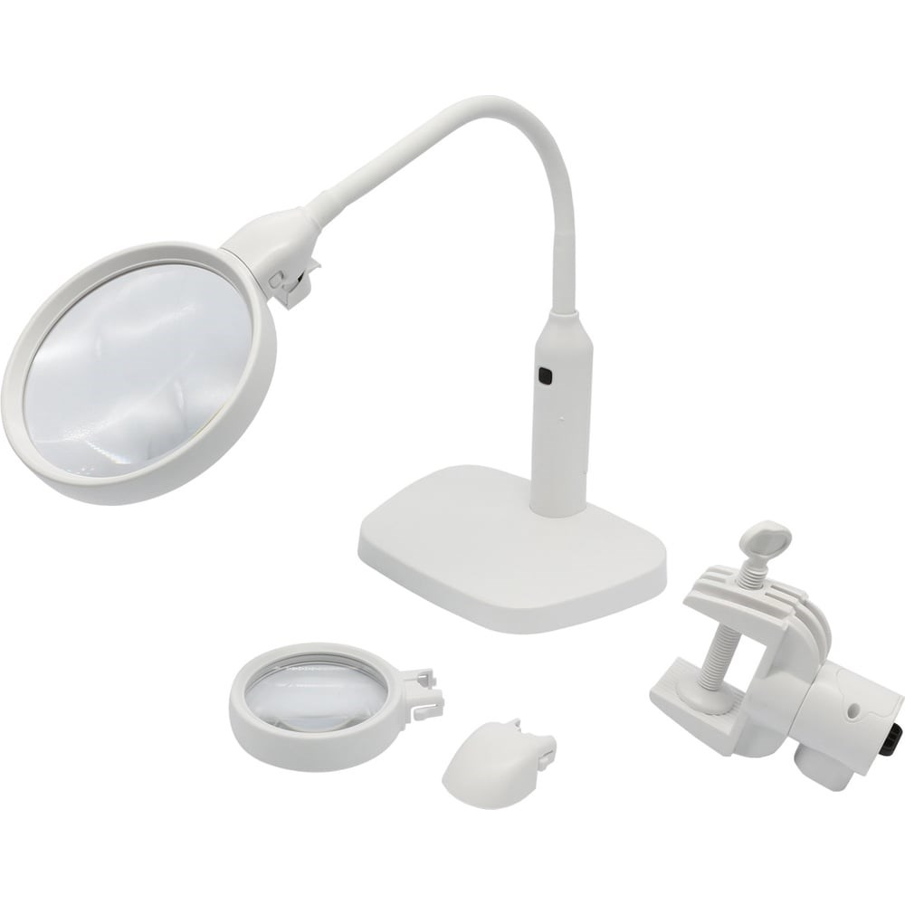Пластиковая лупа с подсветкой имеет два вида размещения, при помощи струбцины для жесткой фиксации в районе рабочего места и имеет подставку для размещения на столе, подоконнике или другой поверхности. Штатив гнется в любой плоскости. Имеет 2 линзы разного диаметра и кратности увеличения: d 120 мм - 2 кр. и d 75 мм - 5 кр. LED подсветка с 6 светодиодами обеспечивает равномерное и яркое освещение. Лупа удобна для чтения, вышивания или выполнения различной мелкой работы: бисероплетения, изготовления бижутерии, ремонта мелких механизмов. Лупа поможет Вам улучшить качество работы, а также сделает процесс рукоделия комфортным.