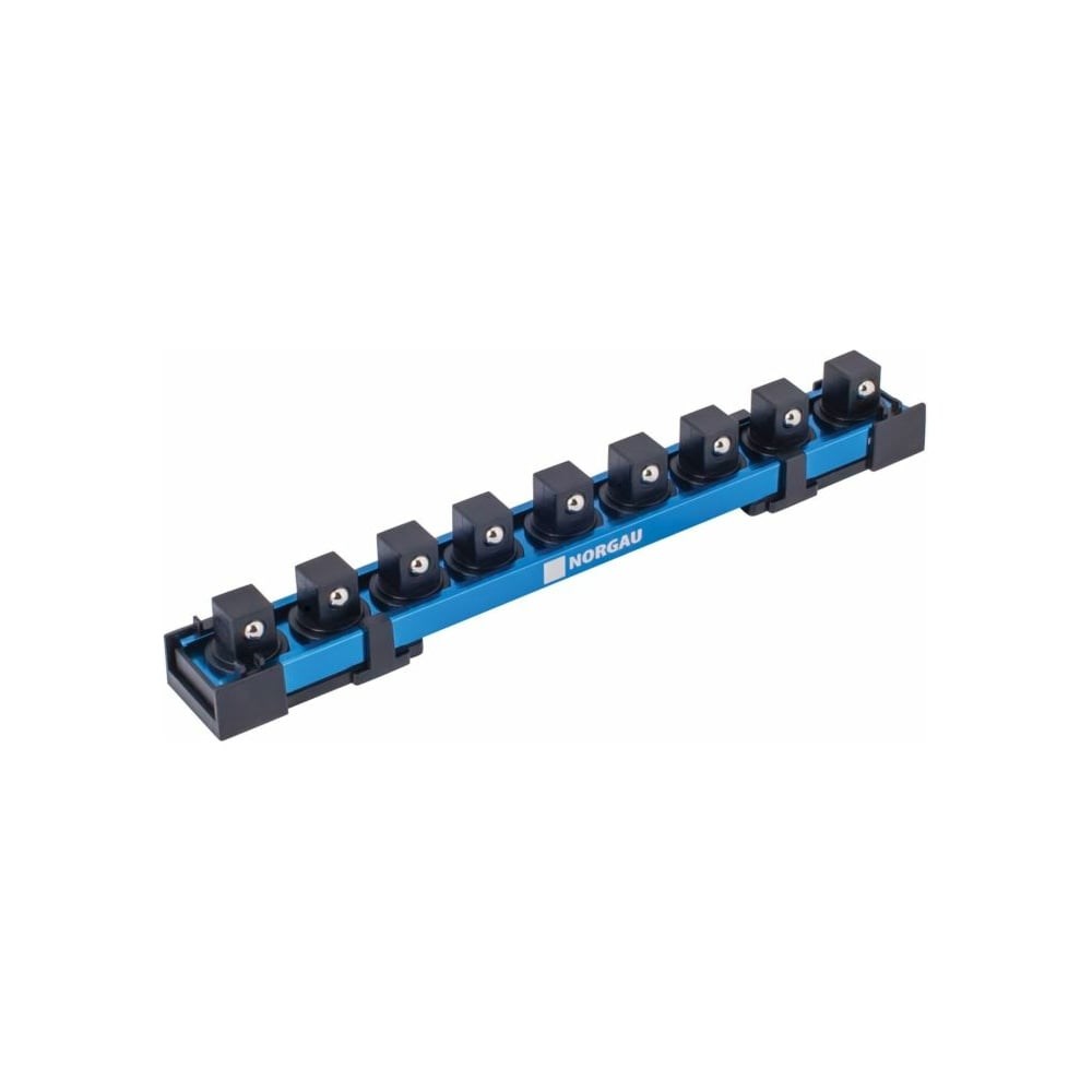 Магнитная рейка для 9-ти торцевых головок с приводным квадратом 1/2" NORGAU 063990012 произведена из анодированного сплава алюминия. Длина изделия - 230 мм. Надежность фиксации конструкции обеспечивается за счет размещения двух фиксирующих магнитов по краям.