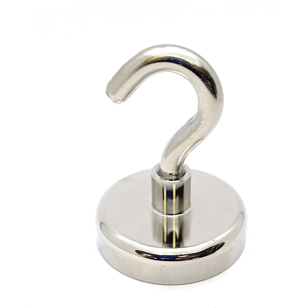 Магнитный крючок ПРОФ-МАГНИТ Е48, сцепление 81 кг, 1 шт. PMYP-Е-48 - это очень мощный магнитный крючок на основе неодимового магнита. На этот магнитный крючок можно повесить любой груз. Этот магнитный крепеж имеет стальной крюк, который можно выкрутить и вкрутить вместо него любой другой метиз с резьбой. Все магнитные крючки в независимости от размера можно подвешивать к потолку (горизонтально) или к стене (вертикально). Для эффективного магнитного сцепления, толщина металлической поверхности к которой примагничивается магнитный крючок должна быть не менее 5мм. Магнитный крючок можно использовать как в помещении, так и на улице в любую погоду. * Обратите внимание, что усилие магнитного крючка на отрыв или сдвиг напрямую зависит от поверхности, к которой вы его примагничиваете. Если металл тонкий (тоньше 15мм), неровный, имеет лакокрасочное покрытие или ржавчину, то сила магнита будет меньше.