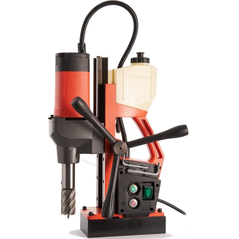 Магнитный сверлильный станок SU-36 - это компактная модель с дополнительной возможностью перемещения шпинделя по направляющей от -25 до +280 мм! Рабочий ход составляет 140 мм. Сверление в металле корончатыми сверлами длиной до 110 мм и диаметром до 36 мм со хвостовиком WELDON19 мм и спиральными сверлами с цилиндрическим хвостовиком диаметром до 16 мм (кулачковый патрон поставляется в комплекте). Эргономичная форма станины с ребрами жесткости имеет очень удобный хват, новое поколение ручек передвижения привода, небольшой бачок для подвода охлаждения с воздушным клапаном для экономии СОЖ. Встроенная система охлаждения - поступление СОЖ изнутри в место сверления и эффективно охлаждать корончатое сверло и металл. Панель управления с утопленными внутрь кнопками как защита от случайного нажатия и повреждения и отсек для хранения 2-х шестигранных ключей. Вертикальное положение шпинделя при необходимости можно поднять вверх до 280 мм от основания магнита для установки дополнительной оснастки или опустить ниже магнитного основания на 25 мм, за счет доп. крепления привода на направляющей двумя винтами. Рекомендуем данный станок к использованию для высотных работ, на небольших производствах, в специализированных цехах металлообработки.