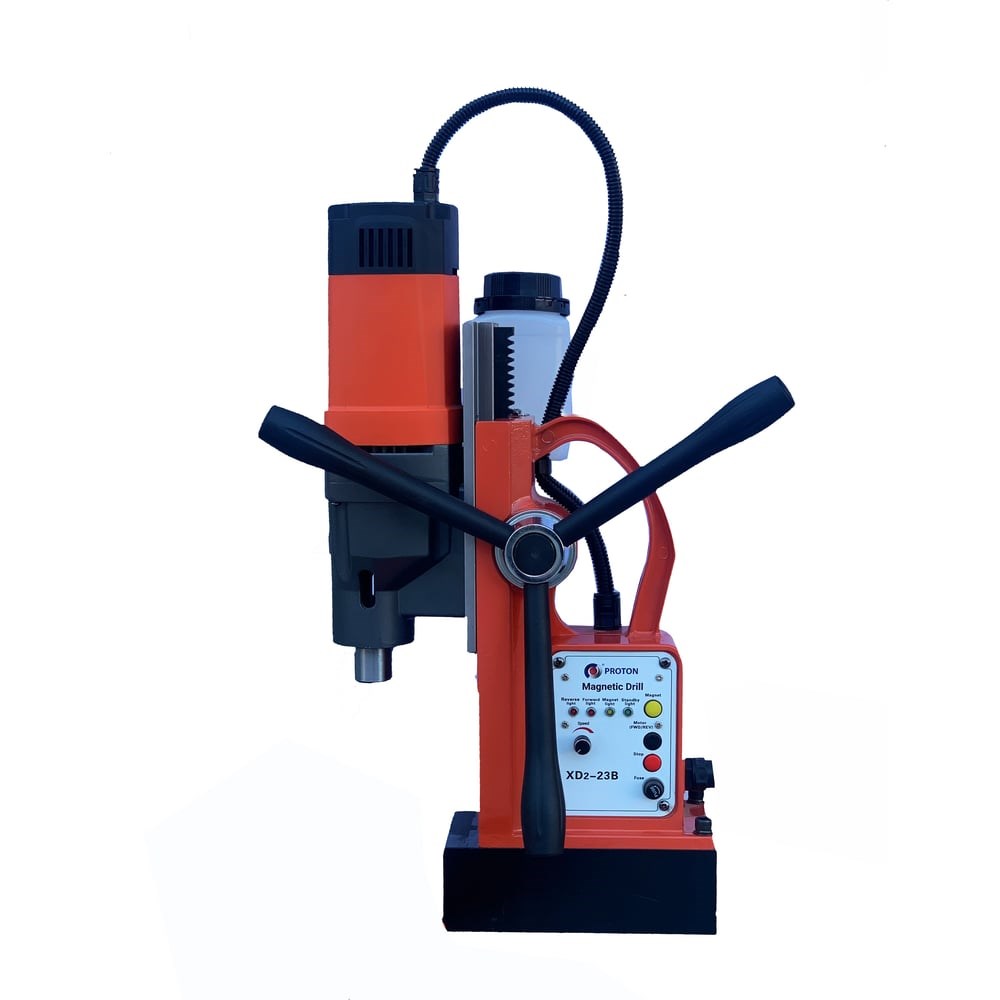 Магнитный сверлильный станок PROTON XD2-23B Т0000026203 предназначен для профессионального использования на строительных площадках и металлообрабатывающих предприятиях. Его особенность состоит в наличии реверса и возможности станка работать метчиками М6-М20. Переход от сверления корончатым сверлом к сверлению спиральным сверлом осуществляется за несколько простых шагов. Отличается удобством и надежностью при эксплуатации. Такой станок незаменим при возведении высотных металлоконструкций, мостов и металлических колонн. Благодаря компактным размерам и небольшому весу, переносной сверлильный станок на магнитной плите фиксируется на любой высоте и может использоваться в замкнутых пространствах и других труднодоступных местах. Износостойкое магнитное основание имеет увеличенный срок службы и увеличенную максимальную удерживающую силу.