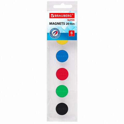 Диаметр магнитов составляет 20 мм. 6 штук в комплекте. Надежно удерживаются на любой железной или стальной поверхности. Магниты BRAUBERG "SUPER" отличаются повышенной удерживающей магнитной силой. Магниты круглой формы выполнены из пластика цветов ассорти. Поставляются в прозрачном пластиковом боксе с европодвесом.