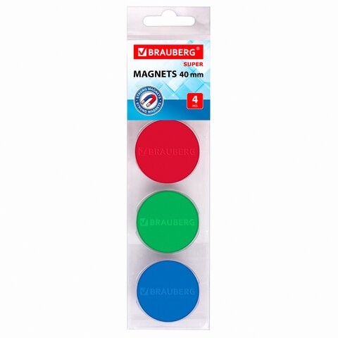 Диаметр магнитов составляет 40 мм. 4 штуки в комплекте. Надежно удерживаются на любой железной или стальной поверхности. Магниты BRAUBERG "SUPER" отличаются повышенной удерживающей магнитной силой. Магниты круглой формы выполнены из пластика цветов ассорти. Поставляются в прозрачном пластиковом боксе с европодвесом.
