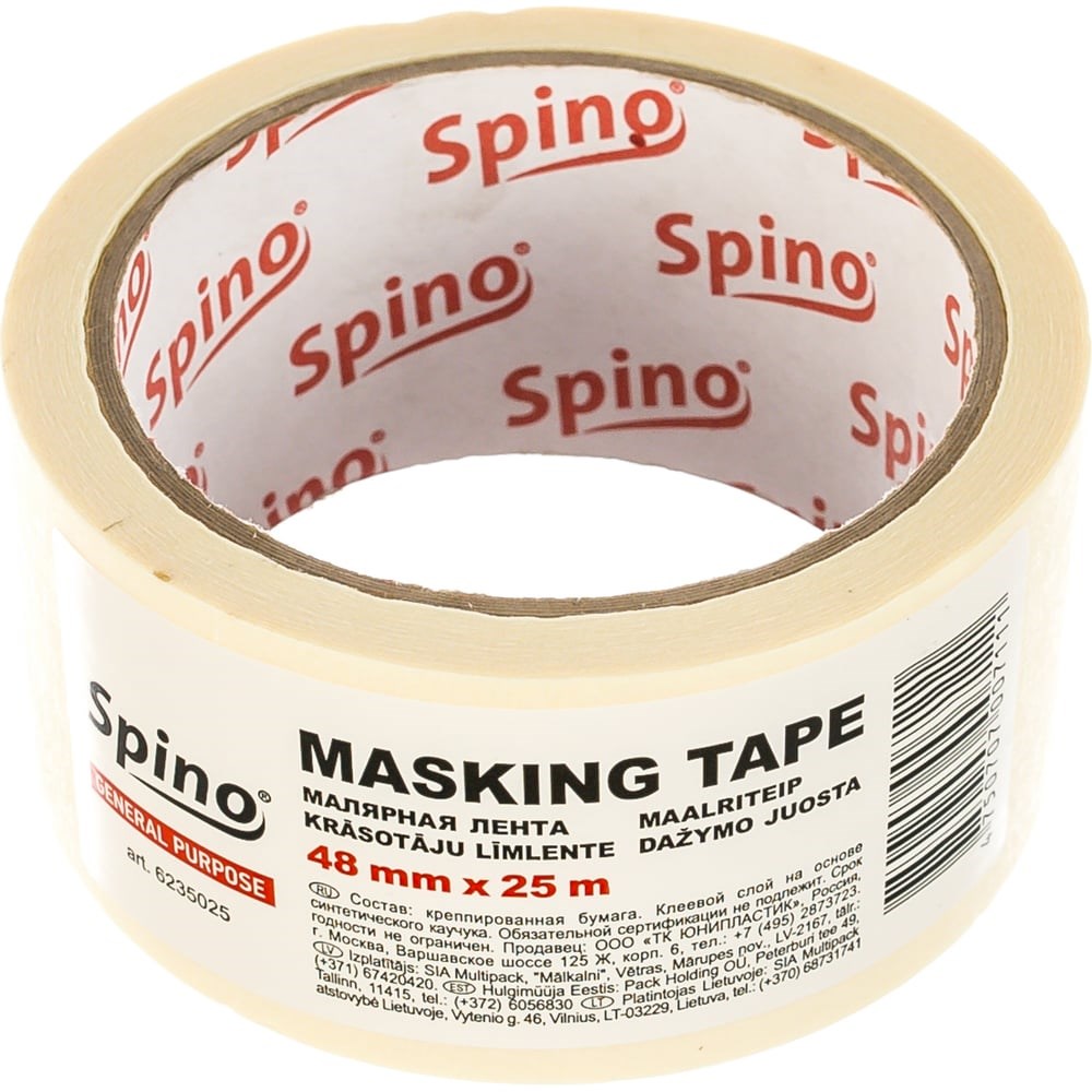 Малярная лента белая 60oC 48ммx25м SPINO 6235025. клей - синтетический каучук. Толщина ленты 105 мкм. Универсальная малярная лента для профессионального и бытового применения. Ширина 48 мм, намотка 25 метров.