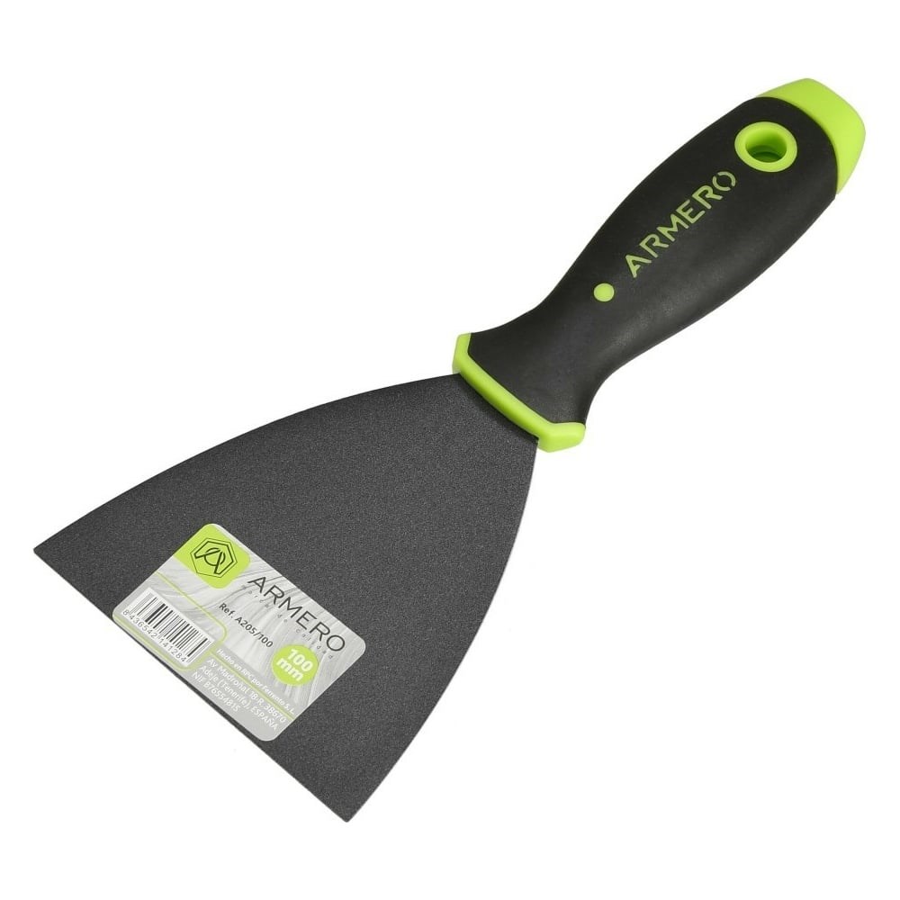 Малярный шпатель тефлон 100 мм ARMERO A205/100 оснащен мягкой рукояткой, которая хорошо ложится в ладонь. Стальное полотно покрыто тефлоном - это исключает налипание влажного материала.