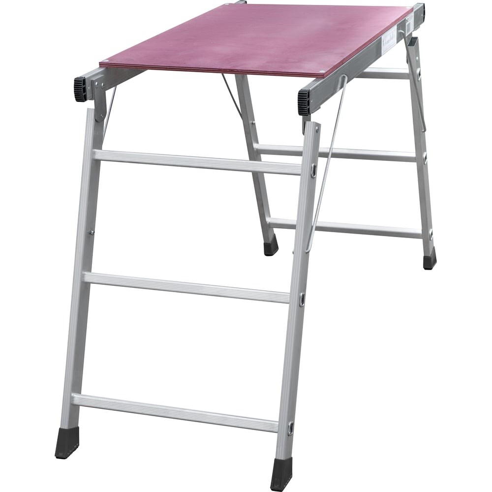 Малярный стол Новая Высота 1360203 - складные рабочие подмости, изготовленные из алюминиевого профиля, идеально подходит для проведения отделочных и ремонтных работ. Несъёмный настил из антисептированной фанеры. Легко устанавливается и складывается в компактное положение для хранения и транспортировки. Ступени с рифлением для безопасного подъема и спуска. Стойки и ступени из прессованного алюминиевого профиля. Многократная развальцовка в соединении ступеней со стойками для высокой прочности и долговечности. Надёжно закреплённые на стойках пластиковые наконечники из двухкомпонентного пластика препятствуют скольжению. Максимальная нагрузка 150 кг.