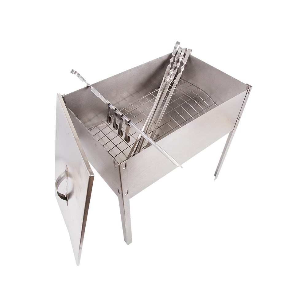 Компактный разборный мангал-коптильня СОКОЛ изготовлен из стали, не подвергается тепловым деформациям от углей и дров. Предназначен для многоразового использования. Сборка и установка мангала производится вручную без использования специальных инструментов. Общая высота ножек 40 см оптимальна и удобна для приготовления шашлыков. Размеры жаровни 40х25 см позволяют разместить шампуры и получить порцию блюда, рассчитанную на небольшую компанию. Толщина стенки – 0.5 мм. Крышка и решетка предусмотрены для организации горячего копчения. В разобранном виде мангал не занимает много места и легко помещается в багажник автомобиля. В комплекте 6 угловых шампуров размером 41х1х0.08 см.