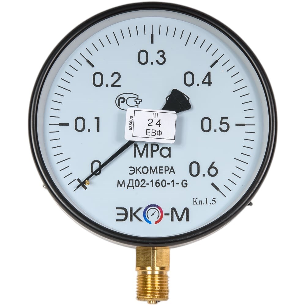 Манометр ЭКО-М Экомера МД02-160мм 0..0,6 МПа G1\2 МД02-160-G-0,6МПа предназначен для измерения давления газообразных и жидких, не сильновязких и кристаллизующихся сред, не агрессивных по отношению к медным сплавам (вода, пар, газ) или вакуума. Межповерочный интервал 2 года.