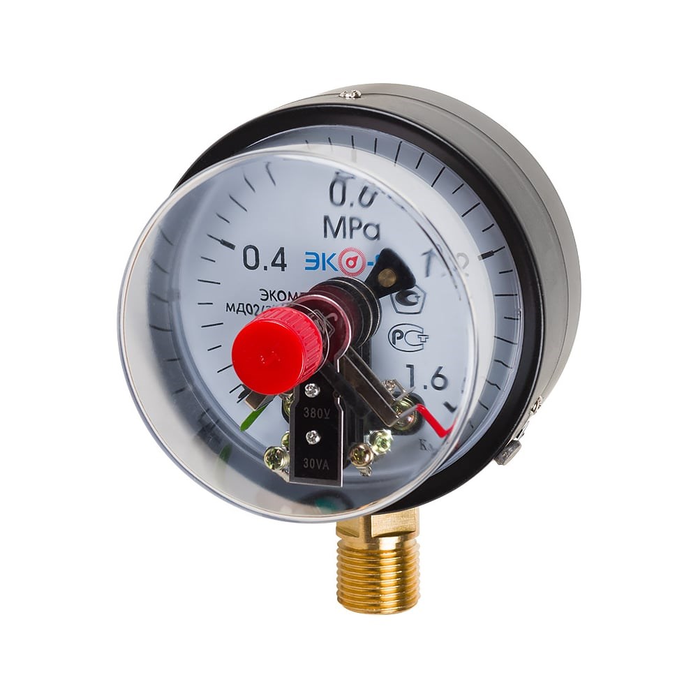 Манометр с электроконтактной приставкой ЭКО-М Экомера -100мм 0..1,6МПа, М20х1,5 Исп V МД02Э-100-М-1,6МПаукомплектован электроконтактами прямого действия с подмагничиванием и подпружиниванием контактных площадок для предотвращения их "дребезга" Контакты покрыты специальным материалом для предотвращения их окисления.Точки срабатывания контактов настраиваются вручную (специальным ключом) на всем диапазоне измерения манометра.Класс точности манометра с электроконтактами - 1,5.Погрешность срабатывания контактов - 2-5% от диапазона измерения.Все приборы поверены и внесены в АРШИН.