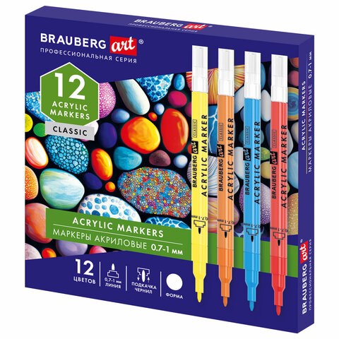 Маркеры акриловые для рисования и хобби 12 ярких цветов, линия 0,7-1 мм, BRAUBERG ART CLASSIC,152521