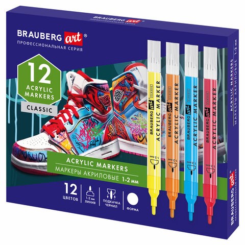 Маркеры акриловые для рисования и хобби, 12 ярких цветов, линия 1-2 мм, BRAUBERG ART CLASSIC,152523