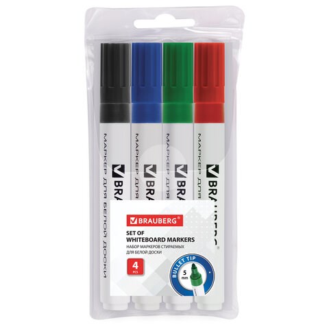 Маркеры стираемые для белой доски НАБОР 4 ЦВЕТА, BRAUBERG, 5 мм, 150417