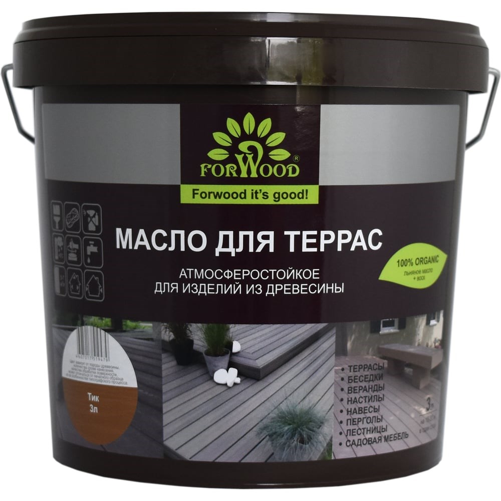 Масло для террас Forwood (тик; 3 л) 4607017519479 защищает дерево от воздействия атмосферных осадков, влаги и грязи, уменьшает растрескивание. Применяется для необработанной, термообработанной или обработанной ранее маслом древесины, а также для защиты террас, садовой мебели, лестниц, и т. п. Водоразбавляемая эмульсия льняного масла для древесины, содержащая воск. Придает поверхностям благородные оттенки ценных пород. Для наружных и внутренних работ. Не использовать для твердых пород древесины (лиственница, дуб и т.д.).