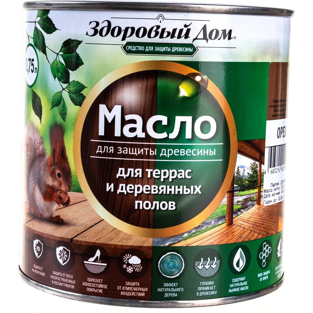 Масло для террас и деревянных полов Здоровый Дом орех 0,75 л Лк-00009553 применяется для защиты и декоративной отделки древесины. Продукт не образует пленку на поверхности. Эффективно защищает от влаги, УФ-лучей и других атмосферных воздействий. Препятствует гниению, образованию плесени и древесной синевы. Продукт подходит для тонировки деревянных полов, защищает от влаги, грязи и грибков, допускает влажную уборку. Поврежденные участки легко реставрируются.