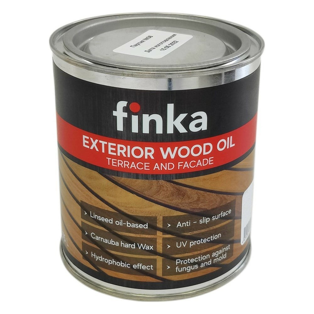 Масло для террас и фасадов Finka Exterior Wood Oil для внутренних и наружных работ, льняная основа, Натуральный (Natural), 0.75 л FO-075N создано на основе лучших скандинавских технологий в защите древесины. Состоит из высококачественных природных материалов. Основа из льняного масла - отличная защита от синевы, гнили и плесени, а тунговое и касторовое масло придают износостойкость, гидрофобность. Растворителем является алифатический углеводород, который не поднимает ворс, поэтому не требует межслойной шлифовки.В составе твердый воск карнаубы - это железобетон в масле, придает превосходную износостойкость, защищает от УФ излучения.Более 70% сухого остатка. Продукт предназначен для наружных работ и внутренних работ. Идеально подходит для террас, фасадов, беседок, садовой мебели. Состав подчеркивает естественную красоту и фактуру древесины. Глубоко проникает в поры, не образует пленку, что позволяет древесине дышать. Расход: в один слой 20 кв. м/л, в два слоя 10-15 кв. м/л. Расход зависит от качества подготовки поверхности и впитывающей способности древесины. Важно! Опасность самовозгорания. Пропитанный маслом рабочий материал (ветошь, одежда, шлифовальная пыль) промыть водой, и утилизировать в герметичной металлической таре. Опасность самовозгорания. Продукт сам по себе не склонен к самовоспламенению. При работе с маслом обеспечьте вентиляцию воздуха.