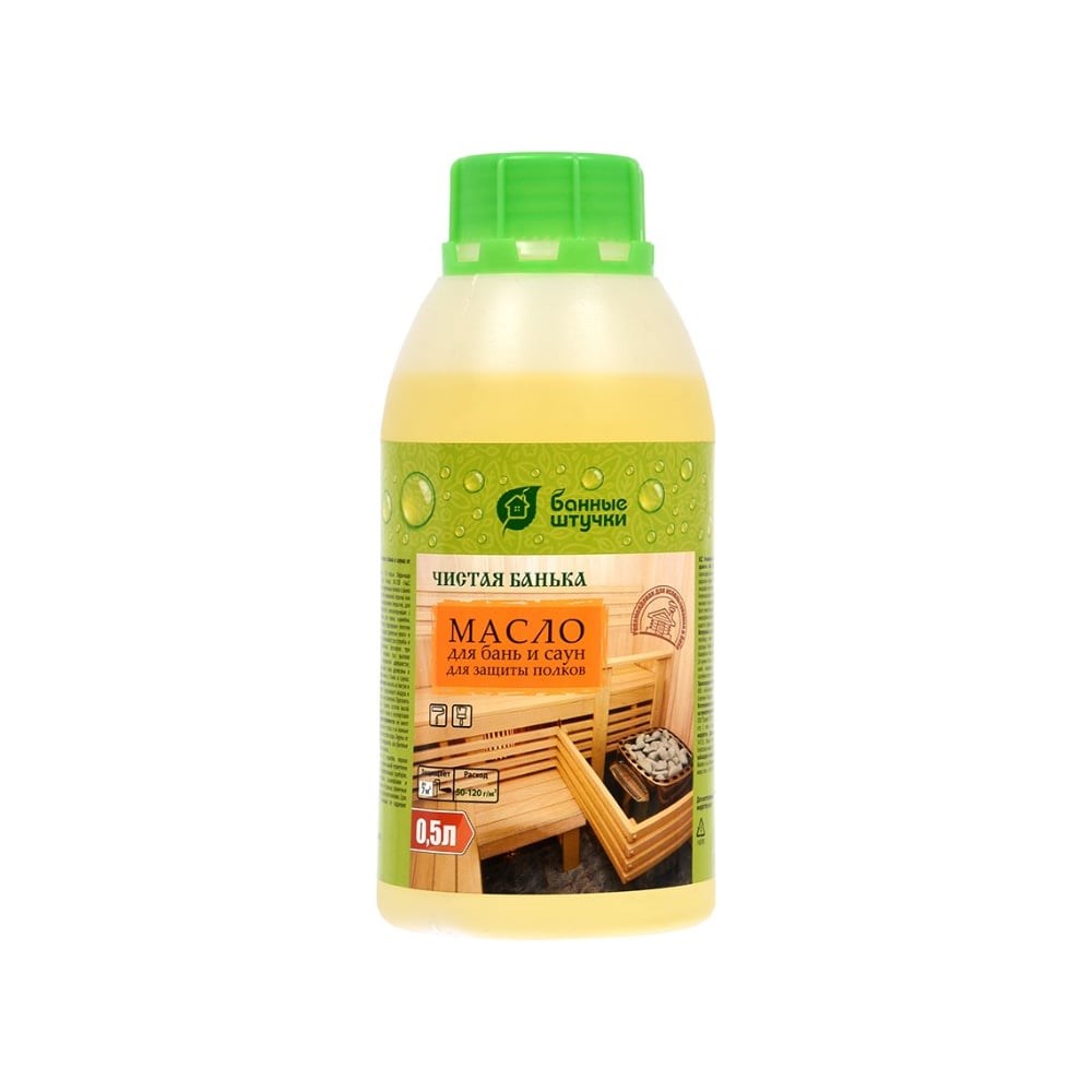 Масло для защиты полков для бани и сауны Банные Штучки Чистая банька 0,5 л 4 34996 на основе натуральных масел для защиты деревянных полков в банях и саунах от грязи и влаги. Применяется в качестве финишной отделки как самостоятельное защитное и декоративное покрытие, для обработки деревянных поверхностей, контактирующих с кожей человека полки, опоры для спины, скамейки, подголовники и т.д.). Препятствует образованию плесени дереворазрушающих грибков, придает древесине влаго- и грязе- отталкивающие свойства, увеличивает срок службы и подчеркивает структуру древесины. Безопасно при соприкосновении с кожей человека при высоких температурах. Образует на поверхности шелковистое, бесцветное покрытие.