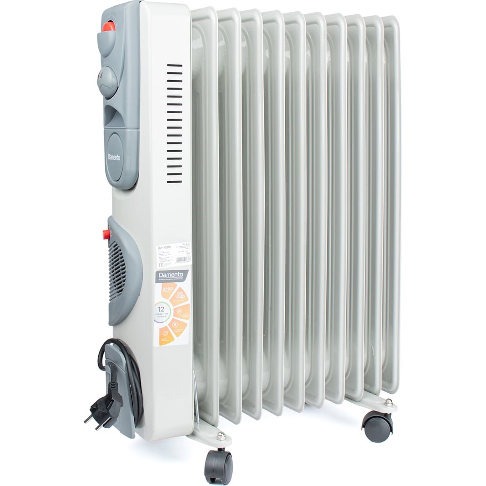 Масляный радиатор DAMENTO REA-11 с вентилятором: эффективный обогрев и комфорт Обогреватель DAMENTO REA-11 с вентилятором предназначен для обогрева помещений площадью до 25 м2. Выполнен из прочного, качественного металла в стильном, современном корпусе из 11 секций, в классическом белом цветовом решении. Технология масляного нагрева обеспечивает максимальную отдачу тепла и энергоэффективность, не сушит воздух и не выжигает кислород. Устройство функционирует в трех режимах: 2500, 1750 или 1000 Вт. Регулировка мощности и наличие терморегулятора добавляют удобства эксплуатации. Напольный комнатный обогреватель снабжён термастатом, имеет механический тип управления, элементы которого вынесены на боковую панель. Конструкцией предусмотрен индикатор включения. Встроенная защита от перегрева повышает долговечность эксплуатации. Прибор получает питание от электросети 220 В, к которой подключается с помощью сетевого шнура. Для его хранения оборудован отсек в корпусе радиатора. Переместить из одного места в другое его просто: для этого предусмотрены удобные ролики.