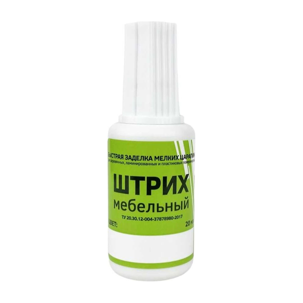 Мебельный штрих предназначен для быстрой заделки мелких повреждений на деревянных, ламинированных и пластиковых поверхностях, подверженных интенсивной эксплуатации. Для обеспечения влагостойкости и защиты поврежденного участка, рекомендуется поверх штриха нанести лак фиксирующий 3-5 слоев с переменной сушкой 5 минут. Виды поверхностей: ЛДСП, МДФ, ламинат, паркет, плинтуса, фанера, массив дерева, лестницы, пластик. Виды повреждений: сколы, царапины, трещины, стыки, швы. Условия хранения: от +5 до +30 градусов. Хранить флакон плотно закрытым, вдали от источников тепла. Свойства: Морозоустойчив. После размораживания, сохраняет первоначальные свойства. Внимание! При замерзании штриха перед использованием выдержать флакон при комнатной температуре не менее 2-х часов. Способ применения: Перед использованием флакон со штрихом тщательно взболтать Реставрируемую поверхность очистить от пыли и грязи Нанести штрих кисточкой тонким слоем на поврежденное место При необходимости нанести дополнительно 1-2 слоя с промежуточной сушкой 5 минут, максимальное количество слоев - 3 Излишки удалить влажной тканью, время полного высыхания 2 часа При загустении разбавить водой, но не более 10% от общей массы Применяется как внутри помещения, так и на открытом воздухе