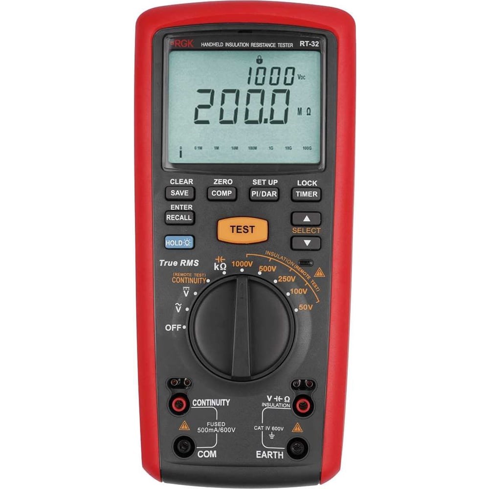 Цифровой мегаомметр RGK RT-32 используется для измерения сопротивления изоляции, оценки ее состояния и определения различных электротехнических параметров. Приборы такого типа востребованы при проведении диагностики и техобслуживания промышленного оборудования, электросетей, а также при работах, связанных с системами электрического обогрева полов в жилых или коммерческих объектах.Ключевые отличия от младшей моделиПо сравнению с RT-30 были существенно расширены возможности, напрямую не связанные с инфекциями изоляционных материалов. К режимам прозвонки и замера напряжения добавились функции определения частоты тока, емкости конденсаторов и тока утечки. Кроме того, в этой модификации расширен рабочий диапазон измерения сопротивления. Благодаря такому функционалу измеритель сопротивления изоляции RGK RT-32 может частично заменить мультиметр.Возможности прибораРасчет индекса поляризации PI.Измерение коэффициент абсорбции DAR.Выбор тестового напряжения.Настройка продолжительности замера сопротивления изоляции.Звуковая сигнализация окончания тестирования.Память на 99 значений и функция сравнения показаний.Полезные особенности электронного мегаомметра RGK RT-32Дополнительная графическая шкала.Фиксация показаний на дисплее.Яркая подсветка экрана и рабочей зоны.Удобная подставка, которая освобождает руки при работе.Полный комплект - батарейки, провода, щупы, зажимы, транспортировочный чехол.
