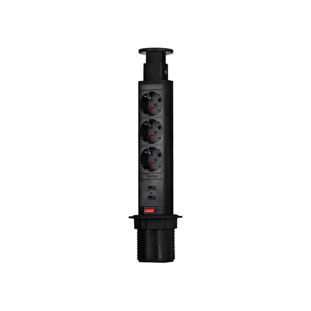 Выдвижной встраиваемый механический блок розеток Mebax 105S 3 2usb чёрного цвета на 3 розетки и 2usb — классический встраиваемый блок розеток с механическим приводом. Стильное и функциональное решение для монтажа в любую поверхность: от кухонной столешницы до компьютерного стола. Альтернатива удлинителям и розеткам.Работа без сбоевОбъединение гнездовых контактов и контактную группу розеток в одно целое обеспечивает защиту блока от перегрева платы, потери контакта и короткого замыкания.Удобная крышкаПокрытие крышки обеспечивает надёжную защиту от механических повреждений, появления царапин и отпечатков пальцев. Крышка розетки не выступает над поверхностью, когда она неактивна.Простое управлениеДля активации устройства нажмите на крышку и потяните корпус блока вверх до щелчка стопора. Чтобы убрать устройство, надавите на стопор, опустите корпус розетки вниз и закройте крышку.Лидер продажMebax 105S является абсолютным бестселлером — за всё время было продано почти 10 тыс. экземпляров. Это универсальный блок, который совмещает необходимый базовый функционал и стильный дизайн.