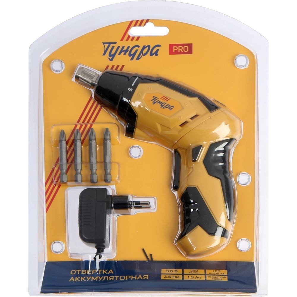 Аккумуляторная отвертка от марки ТУНДРА PRO предназначена для различных работ с крепежом. Изделие оснащено светодиодной подсветкой, что позволяет работать при недостаточном освещении и в труднодоступных местах. Отвертка оснащена рукояткой с прорезиненными вставками, благодаря чему инструмент надежно держится в руке во время работы.