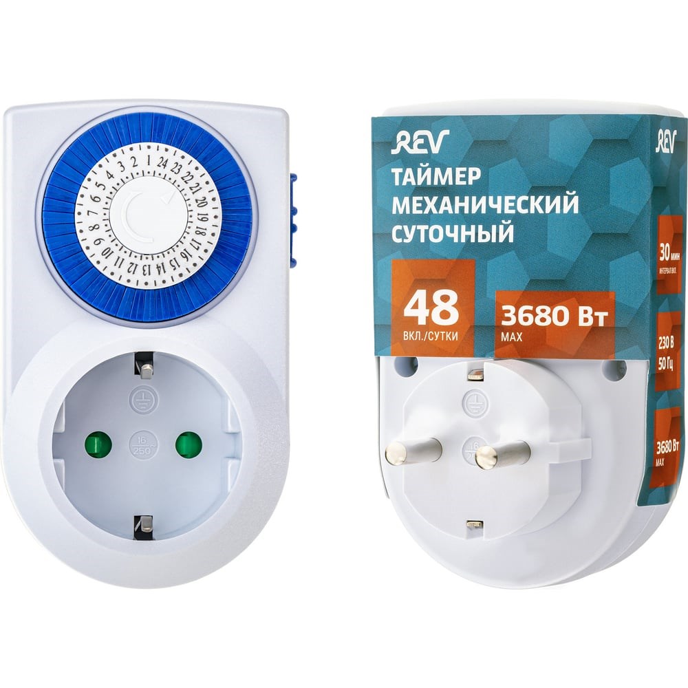 Механический суточный таймер duwi REV "Промо", до 3680Вт, 48 включений в сутки, белый, 67074 8 используется для управления бытовыми электрическими приборами. Данное устройство просто и удобно в использовании. С помощь него можно задать нужное время для включения или отключения любых электроприборов. Таймер не требователен к окружающей температуре, поэтому его можно использовать для включения электрических обогревателей в гараже, на даче или офисе. Это позволит своевременно прогреть то или иное помещение. Использование таймера позволяет экономить электроэнергию. Максимальная подключаемая мощность до 3680 Вт.