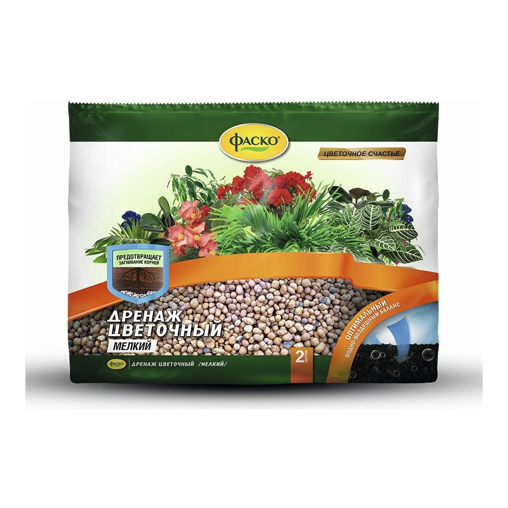 Мелкий дренаж Фаско Цветочное счастье 2 л Of000006706 полностью готовый к использования материал, не требующий стерилизации. Предназначен для выращивания всех видов комнатных растений. Позволяет создать оптимальный влаго- и воздухообмен, что предотвращает закисание грунта. Дренаж отводит лишнюю жидкость от корней растений и исключает возможность их загнивания.