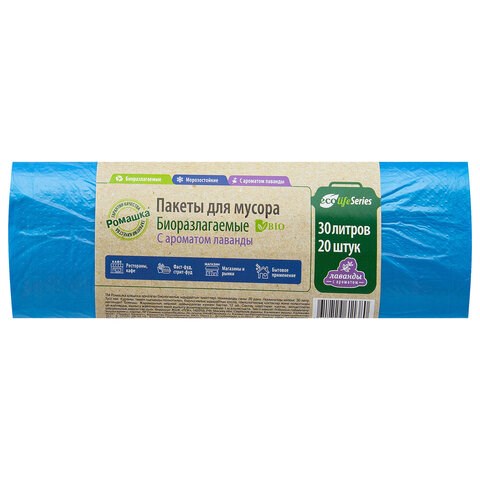 Мешки для мусора биоразлагаемые 30 л, синие, в рулоне 20 шт., ПНД 6 мкм, 50х58 см, "ЭКОЛАЙФ", ЭЛБ302045С