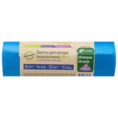 Мешки для мусора биоразлагаемые 60 л, синие, в рулоне 20 шт., ПНД 6,5 мкм, 58х68 см, "ЭКОЛАЙФ", ЭЛБ602040С