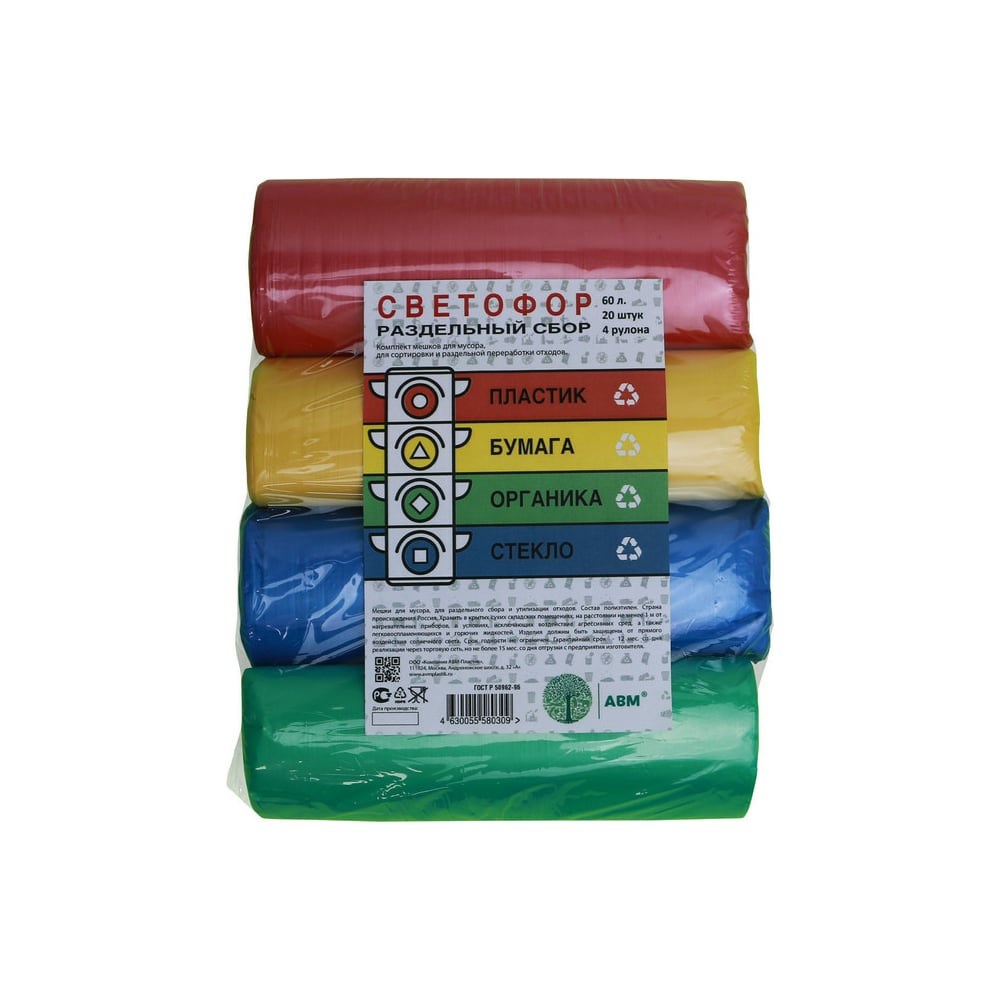 Мешки для мусора Светофор (4 рулона; 20 шт; 60 л; 10 мкм; ПНД; 58х68 см) ООО Комус 988264 - комплект мешков для раздельного сбора мусора для последующей его переработки и утилизации с целью минимизации вреда, наносимого окружающей среде. Мешки удобны в обращении, они прочные герметичные и универсальные в использовании. Различный цвета предназначены для разных типов мусора. Мешки можно использовать как в быту, так и в профессиональной сфере. Дополнительные характеристики: Наличие ручек, завязок: нет. Объем: 4857 см3. Ароматизированные: нет. Биоразлагаемые: нет. Круглое ведро, верхний диаметр, см: 37. Высота ведра не более, см: 40. Тип дна: звездочка. Круглое ведро, объем не более: 40. Прямоугольное ведро, объем не более: 39.