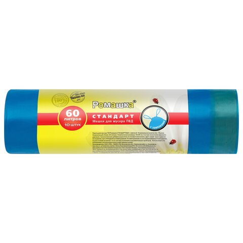 Мешки для мусора Ромашка отличаются высокой прочностью и герметичностью, что особенно важно для компаний, работающих сфере строительства и медицины. Изготовлены из полиэтилена высокого давления (ПВД) плотностью 25 микрон и имеют объем 60 литров. Размер мешка - 60х68 см (±5%). Поставляются в рулоне по 10 штук. Преимуществом данных мешков для мусора является высокая грузоподъемность и крепкие завязки. Цвет: синий.