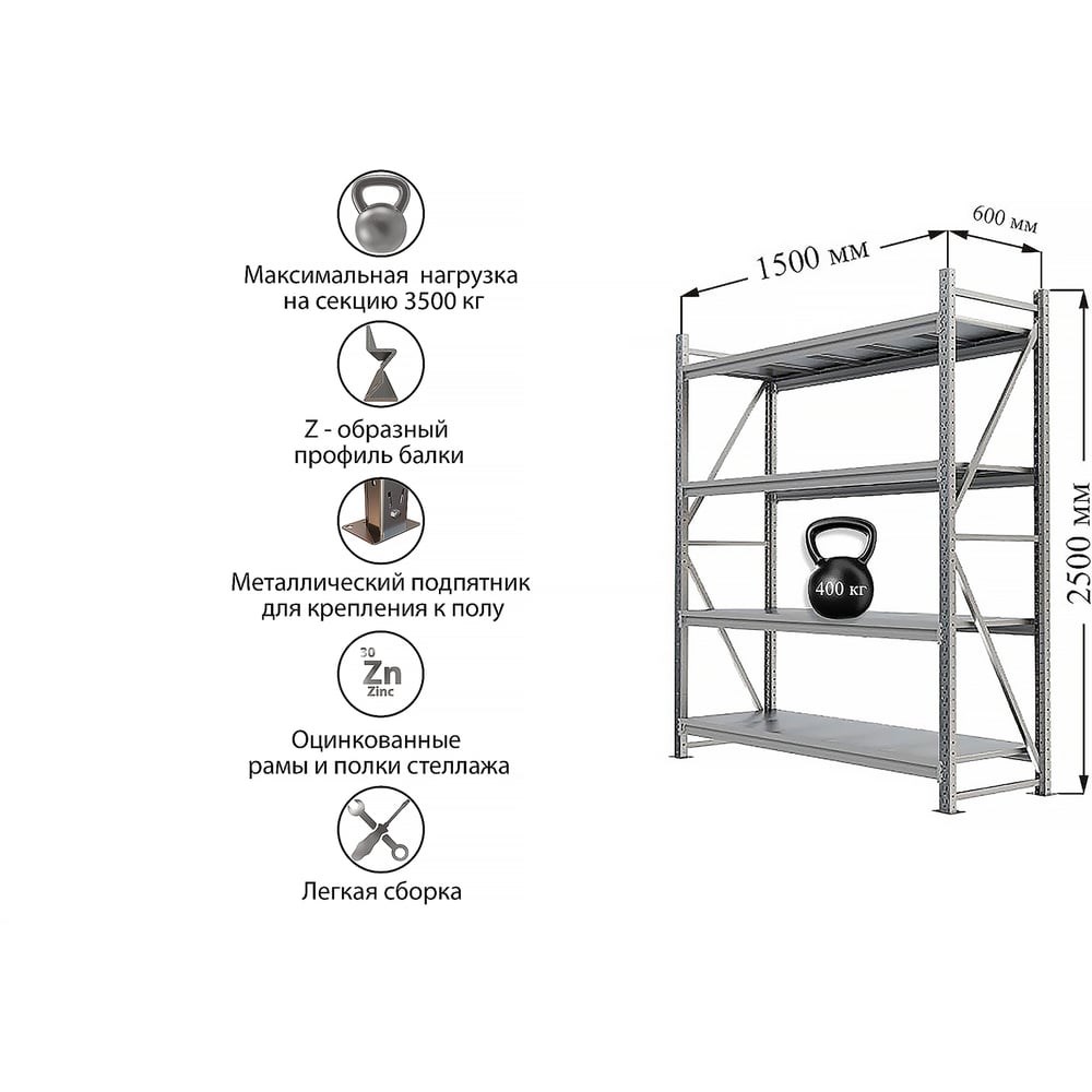 Стеллажи Optimus Pro - профессиональное решение для эффективного складирования! Область применения: Торговые залы и магазины - удобное размещение товаров Промышленные предприятия - хранение материалов и комплектующих Автосервисы и мастерские - организация инструментов и запчастей Складские помещения - рациональное использование пространства Ключевые преимущества: Промышленная прочность - общая нагрузка 3500 кг Усиленная конструкция - продольные ребра жесткости обеспечивают устойчивость Гибкая настройка - регулируемые полки под любые задачи Защита от влаги - можно использовать в помещениях с переменной влажностью Особенности: Пластины-подпятники для крепления к полу Перфорированные стойки для регулировки высоты Усиленные поперечные балки с высотой ребра 75 мм Полки металлические с оцинкованным настилом Шаг регулировки настила 50 мм Почему выбирают Optimus Pro? Надежность - выдерживает значительные нагрузки Универсальность - подходит для коммерческих и промышленных нужд Простота монтажа - легко собирается и настраивается Optimus Pro - современное решение для вашего бизнеса! Металлический стеллаж IRONMEBEL Optimus Pro h-2500 Zn, 4 яруса 1500х600 увеличивает пространство для хранения предметов на складах, в гаражах и подвалах. Подходит для мастерских и производств. Можно использовать в помещениях с переменной влажностью. Благодаря продольным ребрам жесткости на полках имеет большой запас прочности. Высоту полок легко перенастроить.