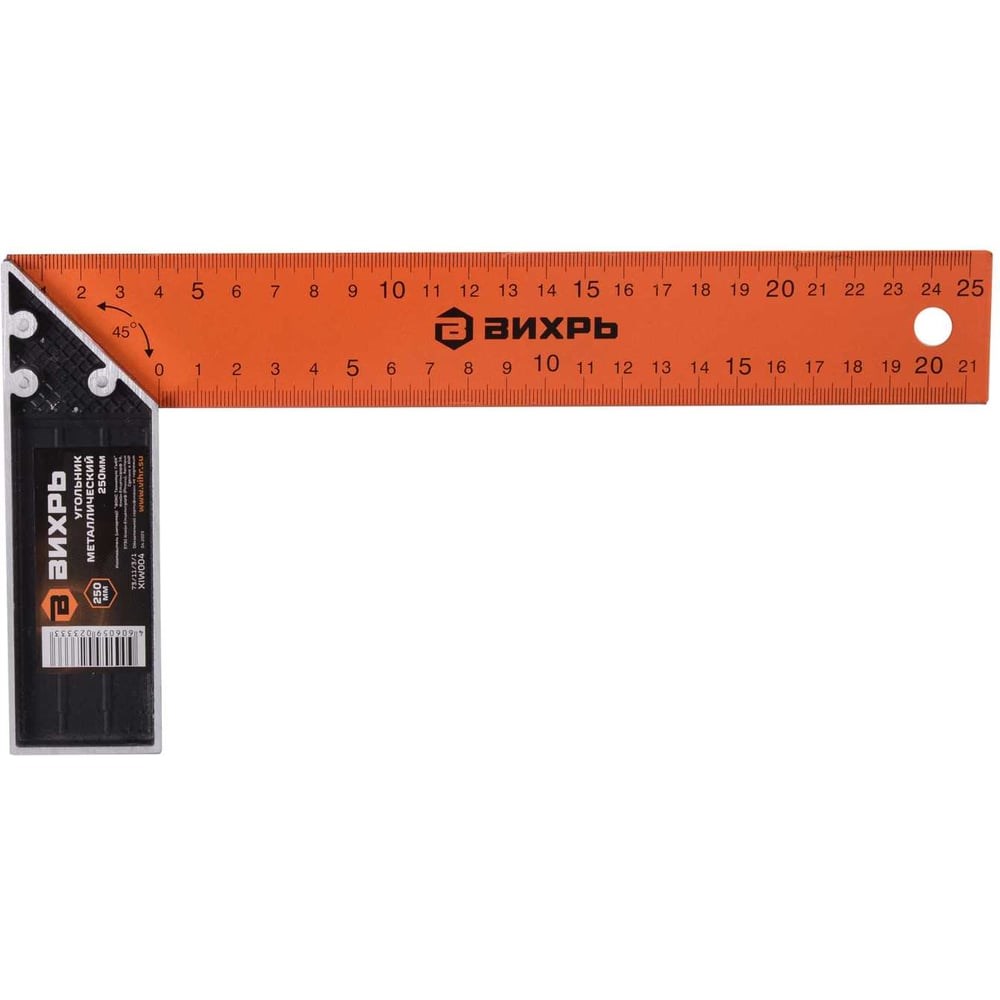 Угольник металлический ВИХРЬ 250 мм используется для измерения расстояния и определения углов 45° и 90°. Он состоит из двух элементов, которые соединены под прямым углом. Его наружная длина 25 см и внутренняя - 21 см. Металлическое основание окрашено для защиты от коррозии. Угольник металлический ВИХРЬ 250 мм поможет легко и быстро выполнять различные задачи, связанные с измерениями углов и прямых линий.