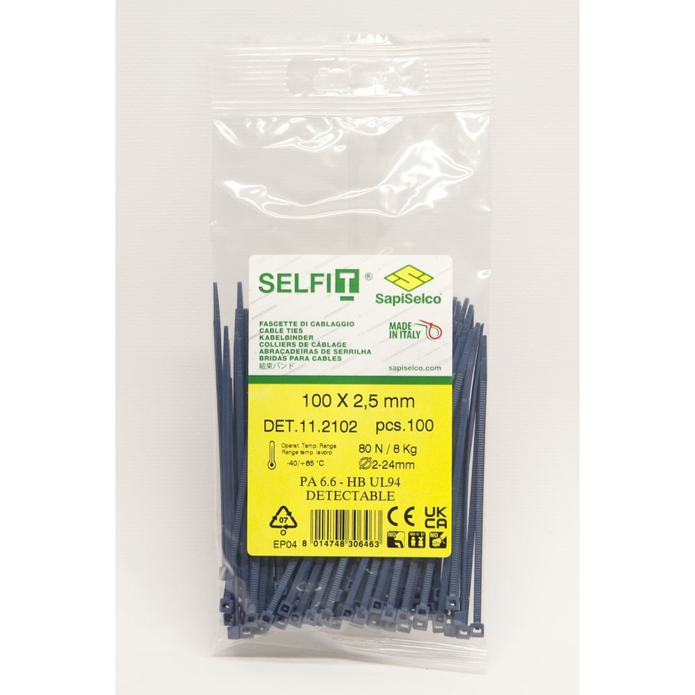 Стяжки SapiSelco металлодетектируемые, самозатухающие, синего цвета, 2.5x100 мм, полиамид 6.6, уп. 100 шт. DET.11.2102R