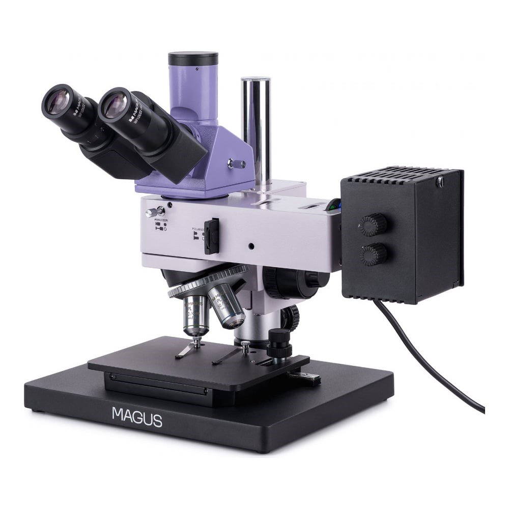 Magus Metal 630 – металлографический микроскоп на штативе оригинальной конструкции. С его помощью можно исследовать микроструктуру непрозрачных образцов – металлов, сплавов, полупроводниковых материалов – любой высоты и геометрии. Освещение рабочей области осуществляется галогенной лампой (отраженный свет), наблюдения ведутся в светлом поле и в поляризованном свете. Микроскоп имеет небольшие размеры и без труда помещается в малогабаритную мебель, может использоваться в ограниченном пространстве. Прибор востребован на предприятиях промышленности, в лабораториях контроля качества, в высших учебных заведениях. Визуальная насадка Тринокулярная визуальная насадка рассчитана на бесконечность. Цифровая камера устанавливается в вертикальный тубус с каналом визуализации. Переключатель светового потока позволяет направлять 100% света или на цифровую камеру, или на окулярные тубусы. Диоптрийная подвижка на левом окулярном тубусе. Револьверное устройство Револьвер на 5 объективов. Свободное отверстие служит для настройки положения лампы осветителя отраженного света. Также в свободное гнездо револьвера можно установить дополнительный объектив, который позволит получить еще одно увеличение. Объективы Объективы-планахроматы с увеличенным рабочим расстоянием предназначены для работы в светлом поле. Фокусировка Коаксиальные рукоятки грубой и тонкой фокусировки расположены с двух сторон штатива. Настройка фокуса происходит плавно и без усилий. Предусмотрена регулировка жесткости хода грубой фокусировки. Штатив Микроскоп помещается на полках высотой 40 см и больше благодаря компактному штативу. Оригинальная конструкция штатива и механизма фокусировки не ограничивает высоту объектов исследования, а двухкоординатный столик удобен для работы с небольшими объектами. Оптический блок вместе с осветительной частью микроскопа устанавливается на штатив индивидуального дизайна и встраивается в производственную линию. Источник света В осветителе отраженного света стоит 30-ваттная галогенная лампа. Она светит достаточно ярко для работы на объективах увеличением от 4х до 100х в светлом поле и в поляризованном свете. Галогенная лампа излучает свет, комфортной для глаз цветовой температуры. Осветительная система отраженного света Микроскоп оборудован встроенным анализатором и съемным поляризатором. Поляризатор вращается в диапазоне 0–360°, анализатор не вращается. При помощи апертурной диафрагмы и полевой диафрагмы настраивается освещение по методу Кёлера. Обе диафрагмы и источник света центрируются. Есть набор светофильтров. Аксессуары Для микроскопа разработана линейка аксессуаров: окуляры, объективы, цифровые камеры, калибровочные слайды.