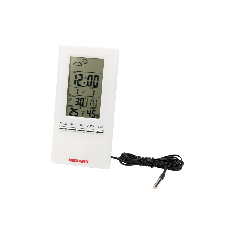 Комнатно-уличная метеостанция REXANT предназначена для измерения температуры в помещении и на улице, а также для измерения влажности в комнате. Широкий функционал устройства делает его оптимальным для использования в домашних условиях, в офисе, а также в учебных и медицинских учреждениях. Изделие оснащено часами (12ч/24ч), календарем, будильником, а также функцией отображения прогноза погоды (солнечно, солнечно и облачно, пасмурно, дождливо). Прибор регистрирует в памяти максимальное и минимальное значения температуры. Для удобства использования температура может отображаться в градусах Цельсия или в градусах Фаренгейта (°C/°F).Технические характеристики:Отображение температуры в помещении и на улице, отображение влажности в помещенииОтображение времениЕдиница измерения температуры С/F изменяемаяПамять максимального / минимального значения температуры2 режима отображения времени: 12ч / 24чЕжедневная функция будильникаСтимулирующий прогноз погодыДиапазон температур:Температура в помещении: 0 С + 50 СТемпература наружного воздуха: -40С +70 СДиапазон влажности: в помещении 20% RH 90% RHБлок питания: AG10 x1 (в комплекте)