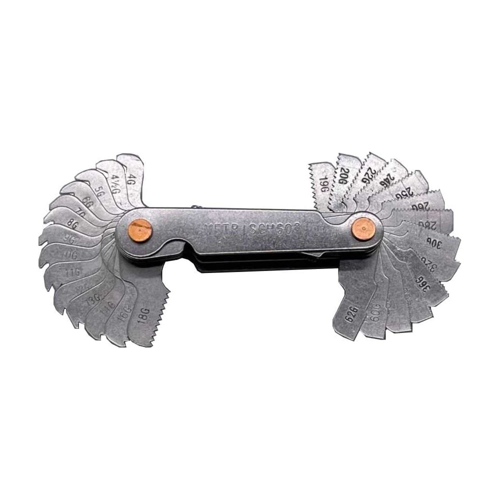 Резьбомер представляет собой набор из 24 эталонных шаблонов, используемых для определения шага метрической резьбы и из 28 эталонных шаблонов для определения шага дюймовой резьбы. Необходим для измерения шагов метрической 60º и дюймовой 55º Шаги метрической резьбы (мм/обор): 0,25; 0,3; 0,35; 0,4; 0,45; 0,5; 0,6; 0,7; 0,75; 0,8; 0,9; 1,0; 1,25; 1,5; 1,75; 2,0; 2,5; 3,0; 3,5; 4,0; 4,5; 5,0; 5,5; 6,0 Шаги дюймовой резьбы (ниток/дюйм): 4G ;4-1/2G; 5G; 6G; 7G; 8G; 9G; 10G; 11G; 12G; 13G; 14G; 18G; 19G; 20G; 22G; 24G; 25G; 26G; 28G; 30G; 32G; 36G; 40G; 48G; 60G; 62G