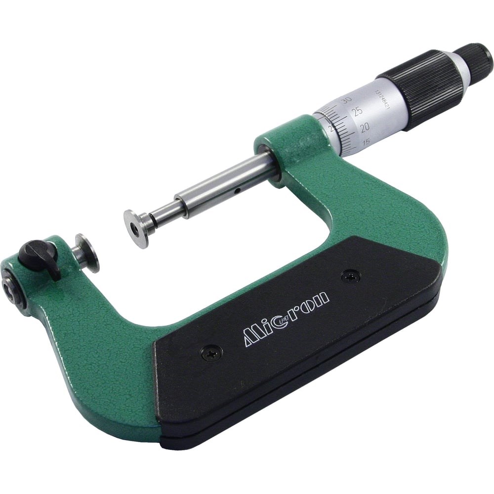 Микрометр со вставками Micron МВУ-125 0.01 МИК 77953 оснащен широкими тарельчатыми губками, которые позволяют измерять ширину и толщину зубцов, а также элементов, расположенных вблизи других конструктивных выступов детали. Для безопасной работы есть трещоточный механизм - он защищает измерительный центр от деформаций при усиленном вращении.